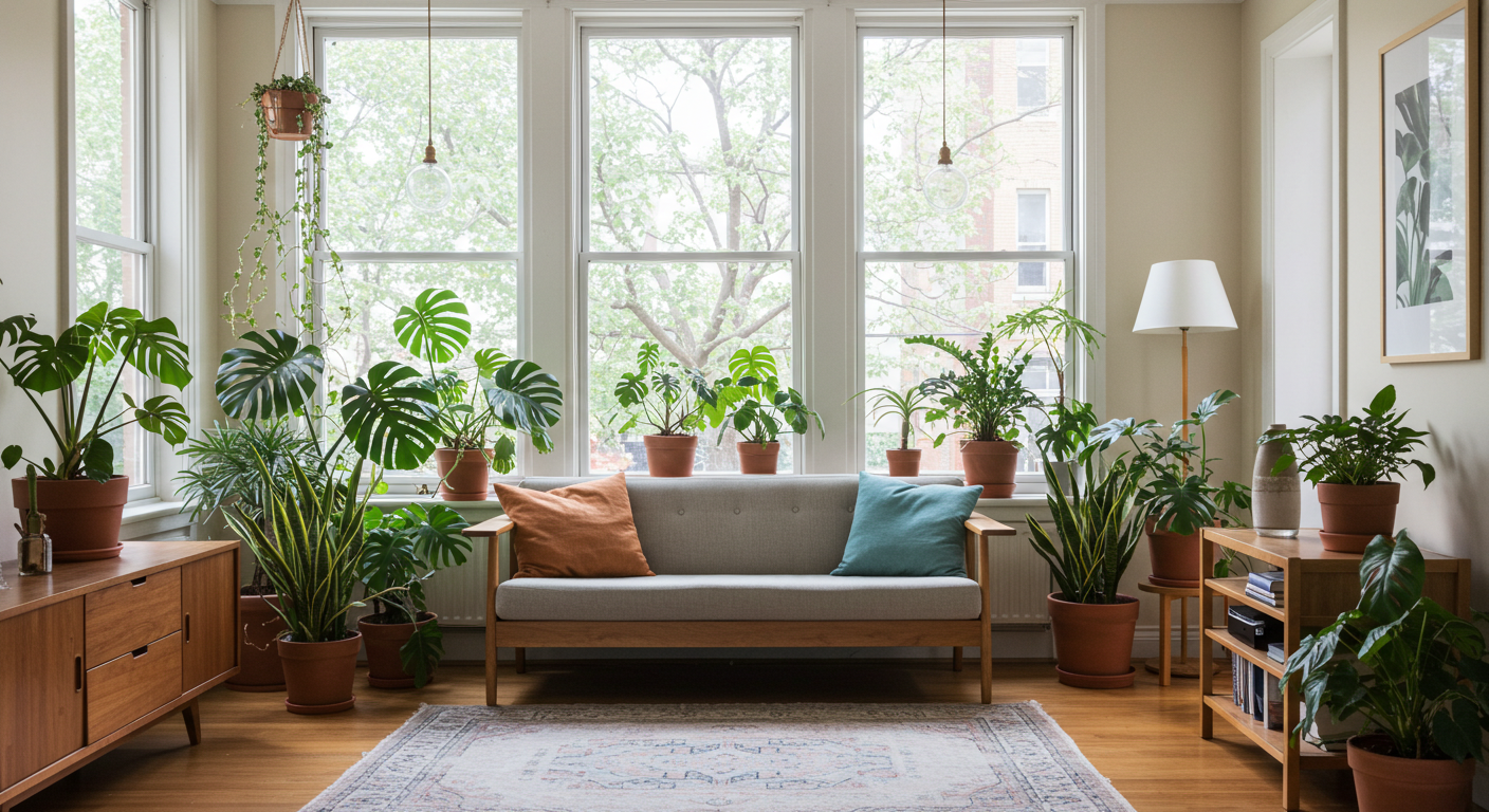 リビングの一角に**“グリーンウォール”や“植物棚”**を設置
